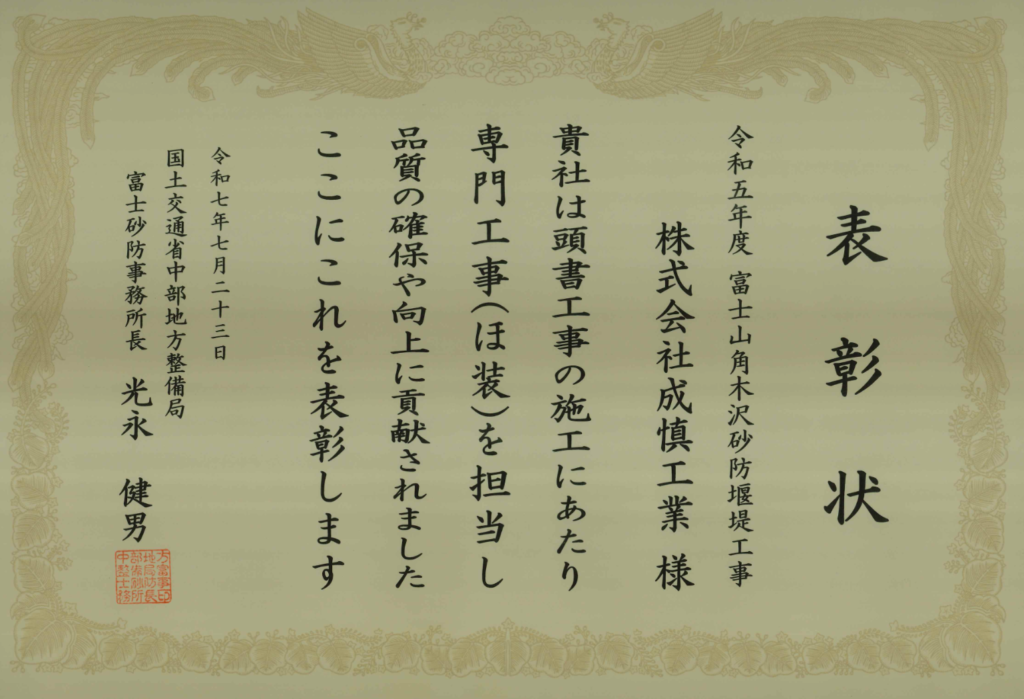 今回の表彰は、当社が「令和5年度 富士山角木沢砂防堰堤工事」において頭書工事(ほ装)を担当し、品質の確保や向上に貢献したことを評価されたものです。日頃から徹底した工程管理と施工品質へのこだわりを持ち続けてきた社員一人ひとりの努力が形となり、地域の皆さまからの信頼につながりました。