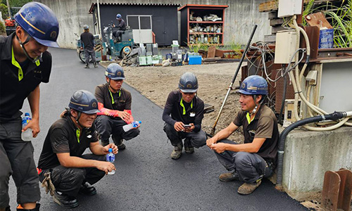 私の仕事は、舗装工事の施工管理を担当しています。現場での安全管理や品質管理、進捗管理、お客様との調整など幅広い業務を担当しています。道路の打ち替え、駐車場のアスファルト整備、その他新築の自宅の周りの舗装など作業する場所は多岐に渡ります。